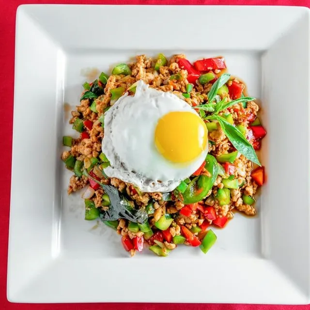 ground chicken, minced bell peppers and onions with thai chili, fresh garlic, thai basil leaves, stir-fried in brown sauce, topped with fried egg